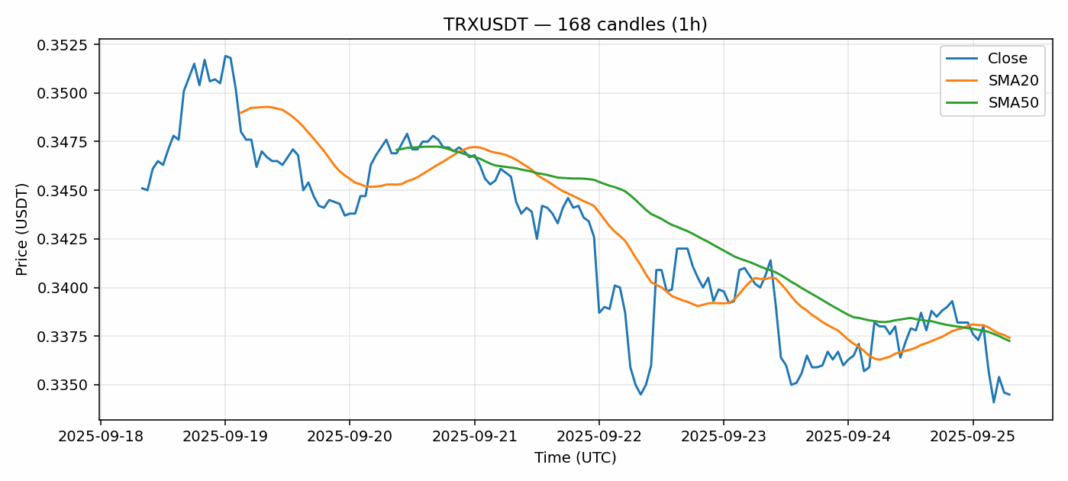TRON — 1h candles, 7D window (SMA20/SMA50, RSI).