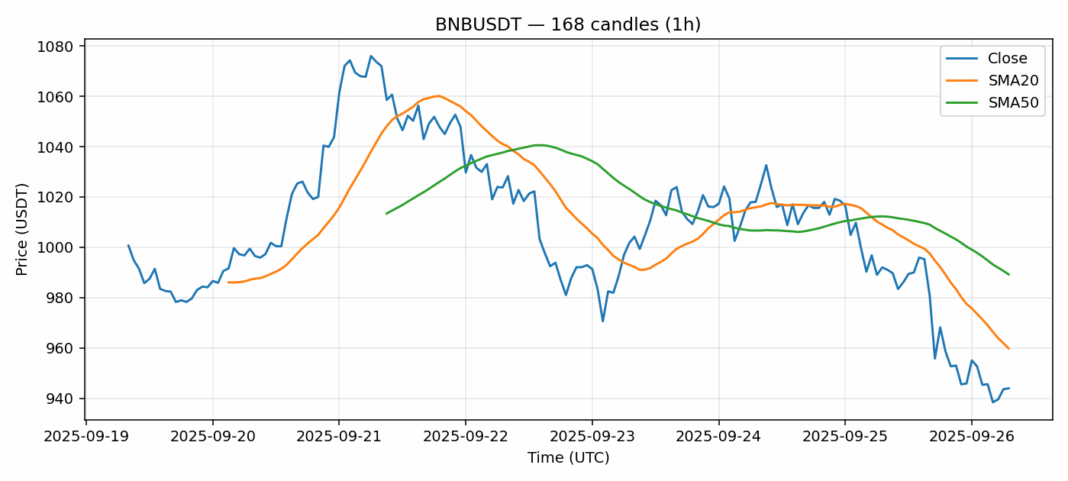 BNB — 1h candles, 7D window (SMA20/SMA50, RSI).
