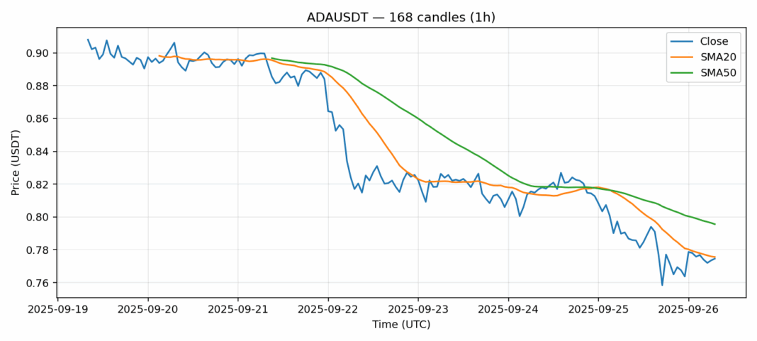 Cardano — 1h candles, 7D window (SMA20/SMA50, RSI).