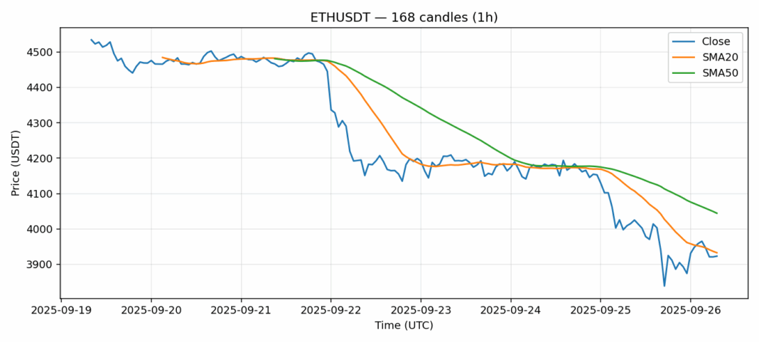Ethereum — 1h candles, 7D window (SMA20/SMA50, RSI).