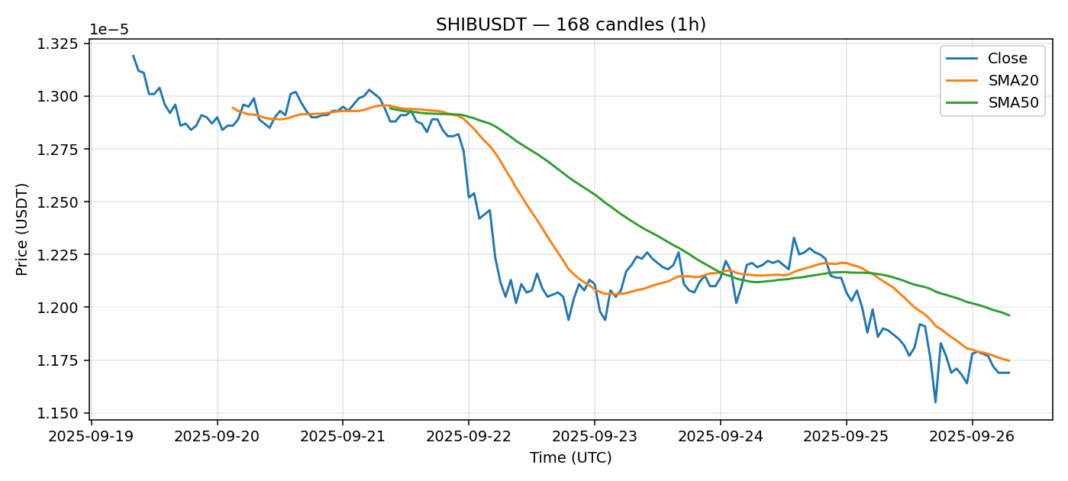 Shiba Inu — 1h candles, 7D window (SMA20/SMA50, RSI).