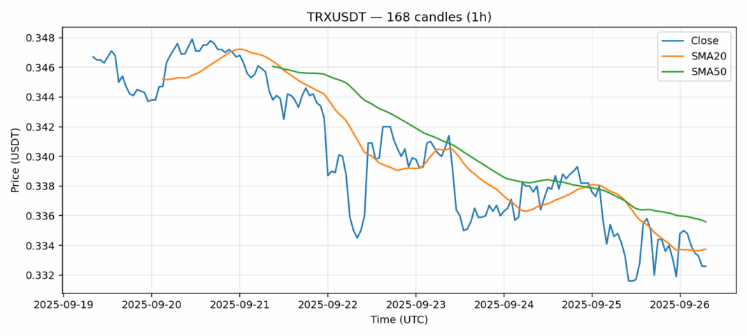 TRON — 1h candles, 7D window (SMA20/SMA50, RSI).