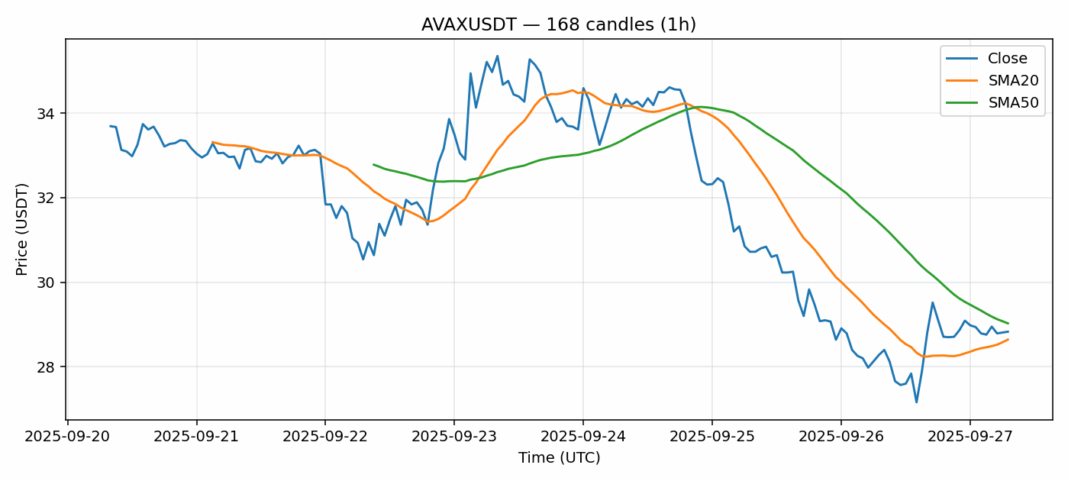Avalanche — 1h candles, 7D window (SMA20/SMA50, RSI).