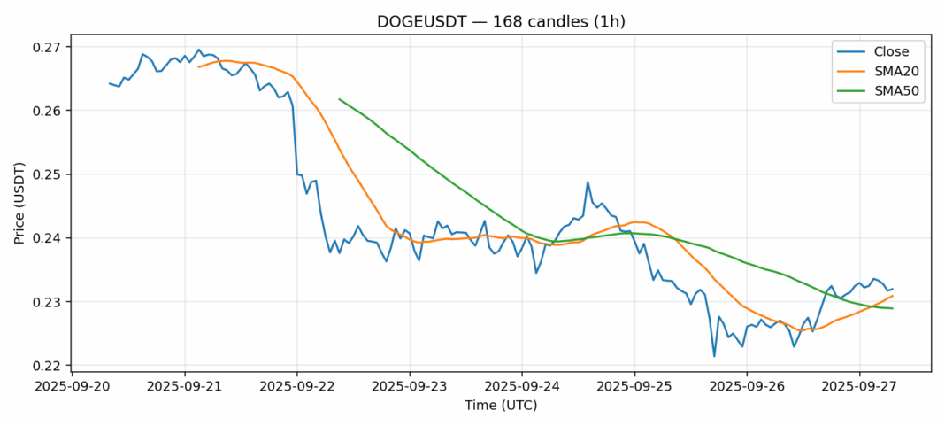 Dogecoin — 1h candles, 7D window (SMA20/SMA50, RSI).