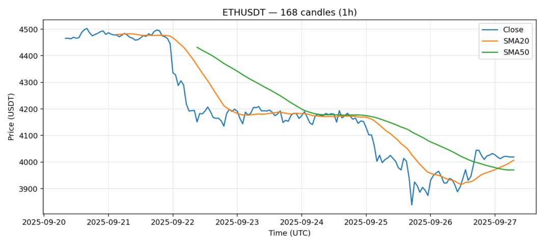 Ethereum — 1h candles, 7D window (SMA20/SMA50, RSI).