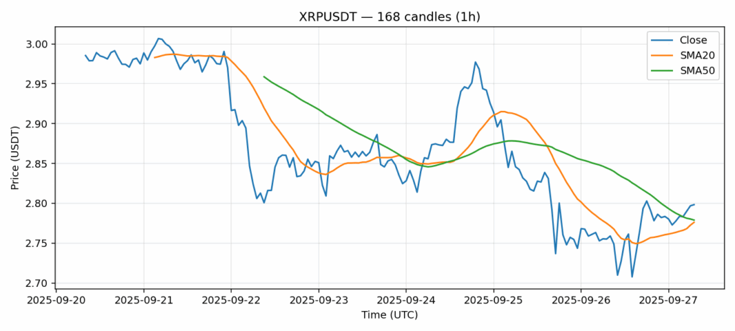 Ripple — 1h candles, 7D window (SMA20/SMA50, RSI).