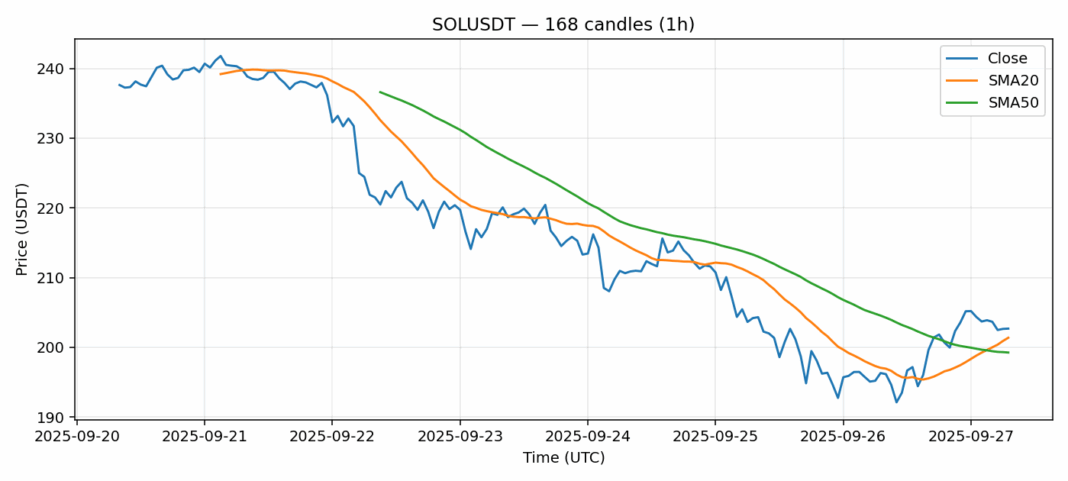 Solana — 1h candles, 7D window (SMA20/SMA50, RSI).