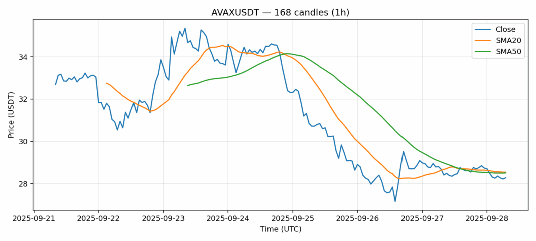 Avalanche — 1h candles, 7D window (SMA20/SMA50, RSI).