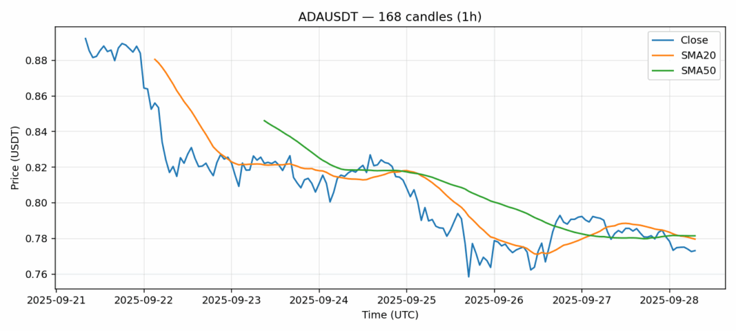 Cardano — 1h candles, 7D window (SMA20/SMA50, RSI).
