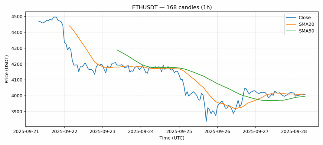 Ethereum — 1h candles, 7D window (SMA20/SMA50, RSI).
