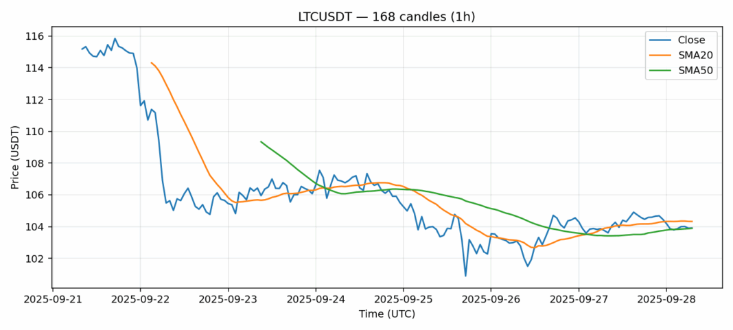 Litecoin — 1h candles, 7D window (SMA20/SMA50, RSI).