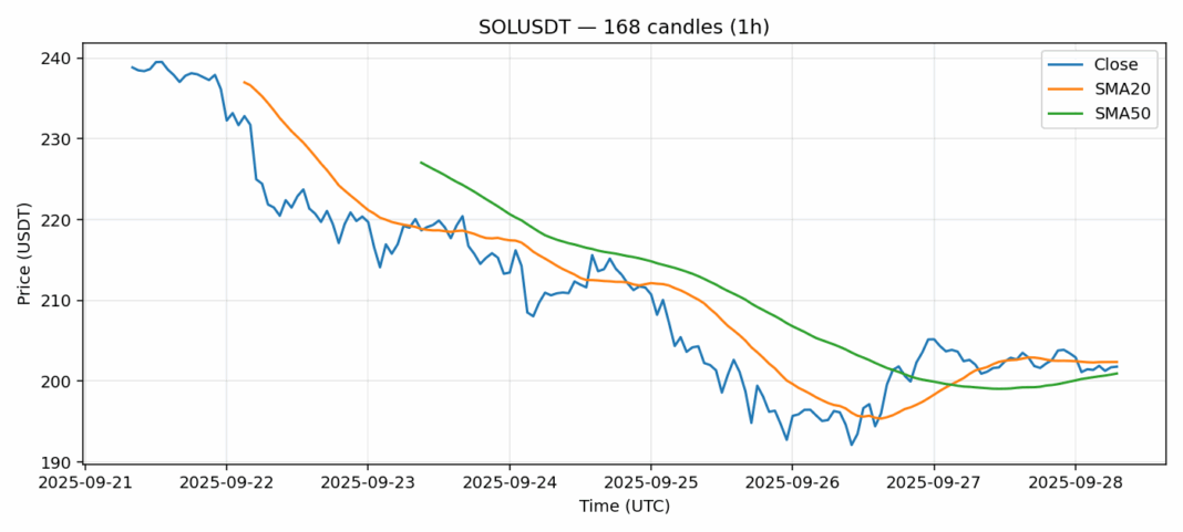 Solana — 1h candles, 7D window (SMA20/SMA50, RSI).