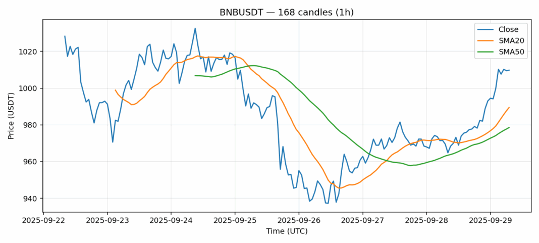 BNB — 1h candles, 7D window (SMA20/SMA50, RSI).