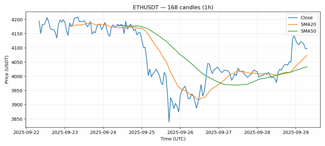Ethereum — 1h candles, 7D window (SMA20/SMA50, RSI).