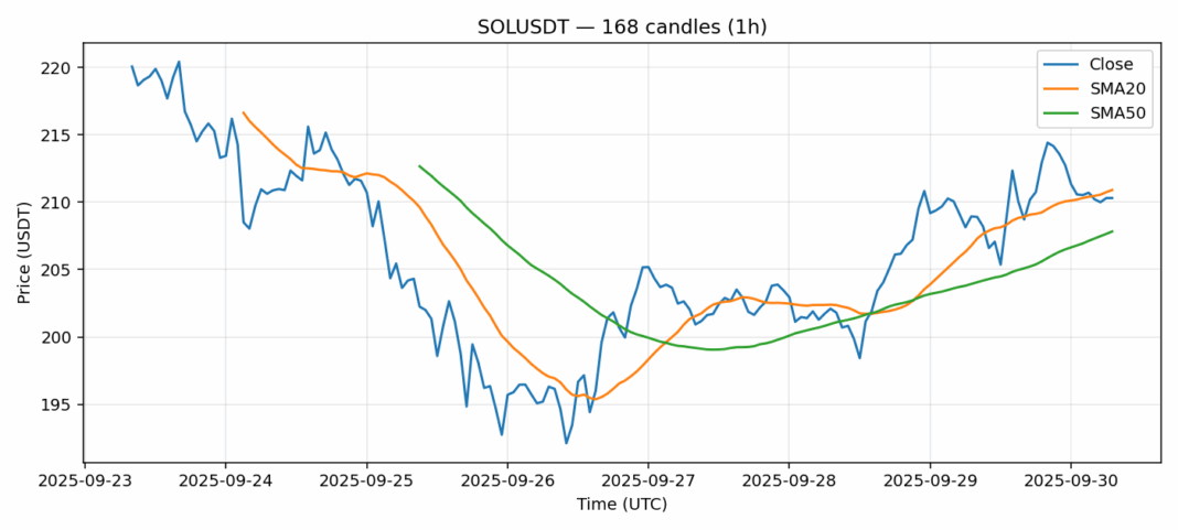 Solana — 1h candles, 7D window (SMA20/SMA50, RSI).