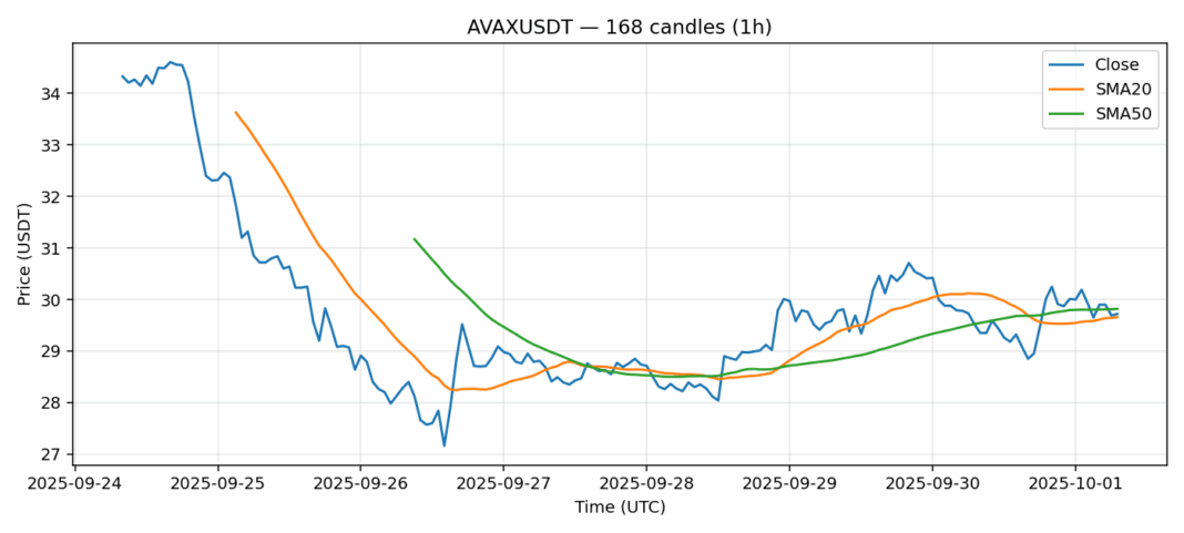 Avalanche — 1h candles, 7D window (SMA20/SMA50, RSI).