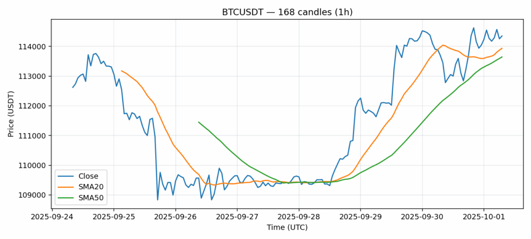 Bitcoin — 1h candles, 7D window (SMA20/SMA50, RSI).