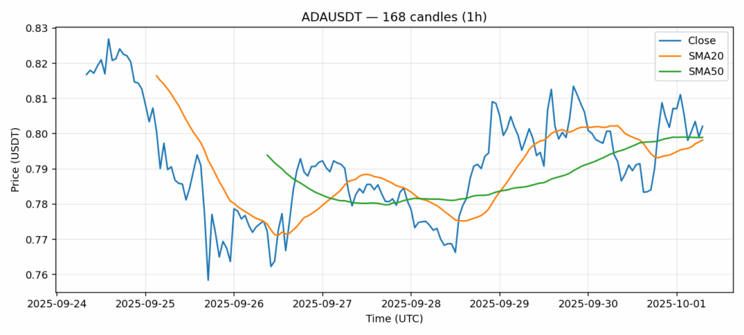 Cardano — 1h candles, 7D window (SMA20/SMA50, RSI).