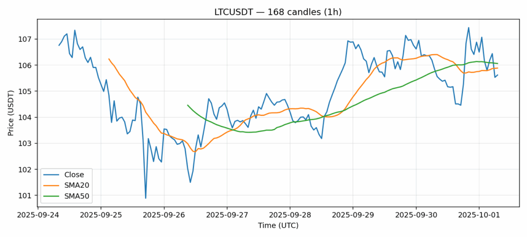 Litecoin — 1h candles, 7D window (SMA20/SMA50, RSI).