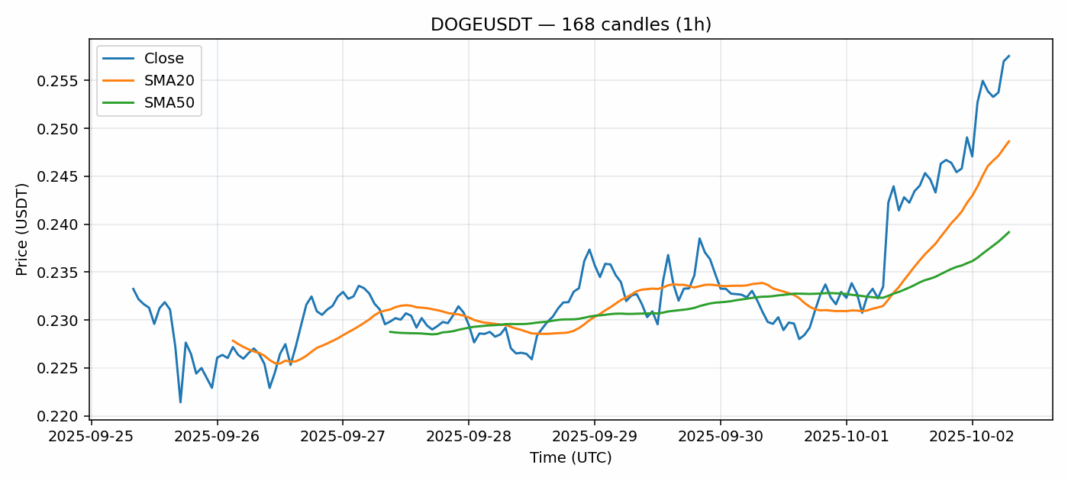 Dogecoin — 1h candles, 7D window (SMA20/SMA50, RSI).