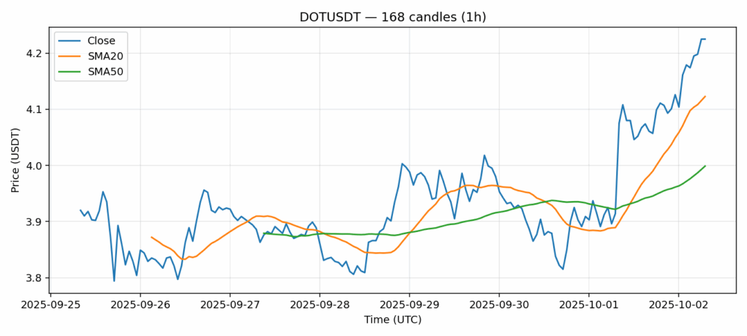 Polkadot — 1h candles, 7D window (SMA20/SMA50, RSI).