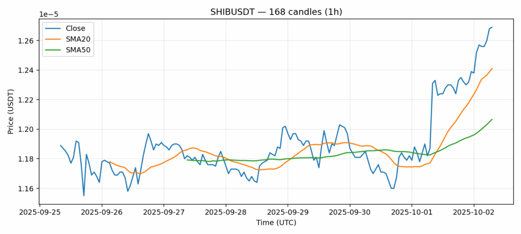 Shiba Inu — 1h candles, 7D window (SMA20/SMA50, RSI).