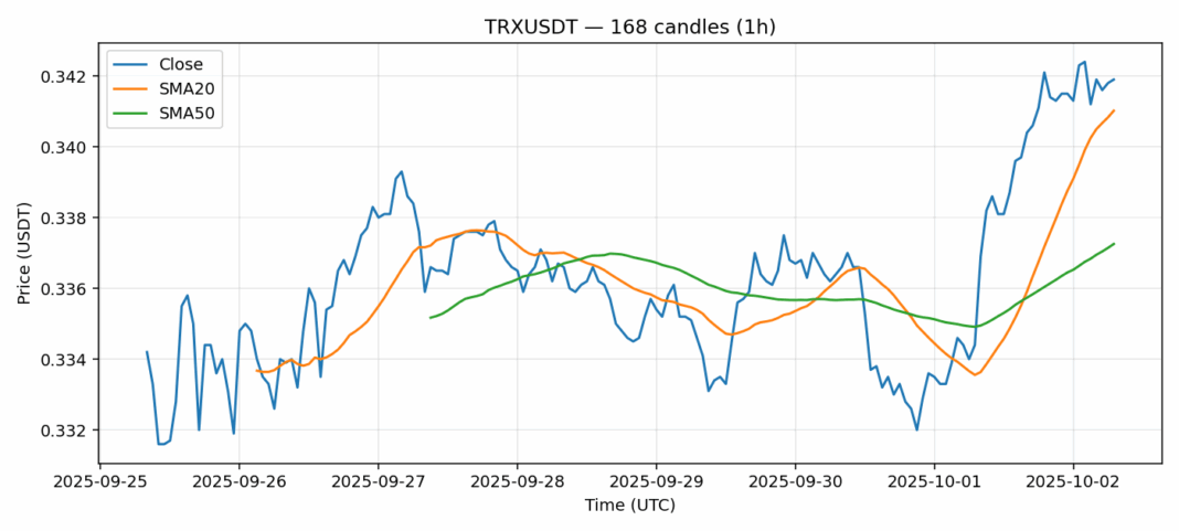 TRX is showing modest bullish momentum, trading at $0.3419 with a 2.34% gain over the past 24 hours. The current price sits just above both the 20-day SMA ($0.34102) and 50-day SMA ($0.33725), indicating underlying strength in the medium-term trend. Volume remains healthy at nearly $100 million, suggesting genuine interest rather than speculative froth. The RSI reading of 60.32 sits in neutral territory, leaving room for further upside before reaching overbought conditions. Volatility remains manageable at 1.15%, providing a relatively stable trading environment. For traders, consider accumulating on dips toward the $0.337 support level with targets at $0.348-$0.352. Stop losses below $0.334 would protect against any breakdown below key moving averages. The technical setup favors cautious optimism, though broader market sentiment will likely dictate the next major move.