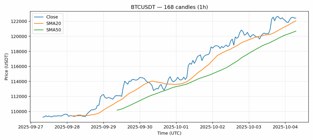 Bitcoin — 1h candles, 7D window (SMA20/SMA50, RSI).