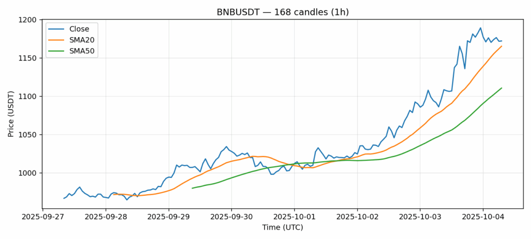 BNB — 1h candles, 7D window (SMA20/SMA50, RSI).
