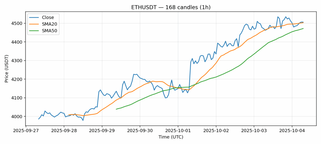 Ethereum — 1h candles, 7D window (SMA20/SMA50, RSI).