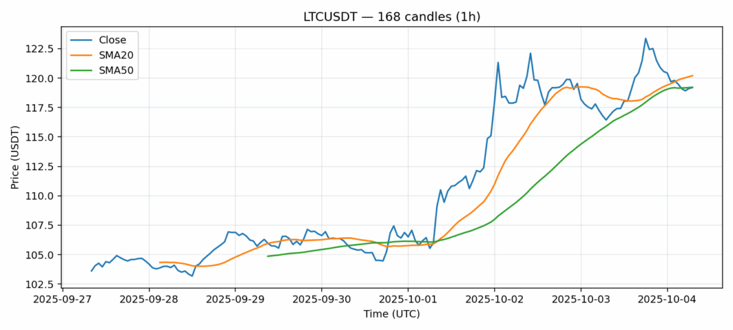 Litecoin — 1h candles, 7D window (SMA20/SMA50, RSI).