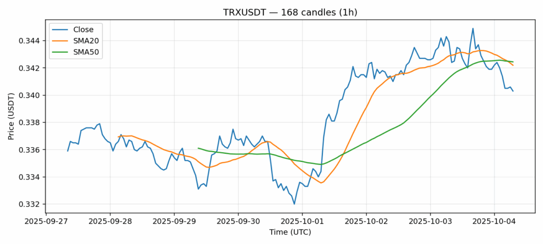TRON — 1h candles, 7D window (SMA20/SMA50, RSI).