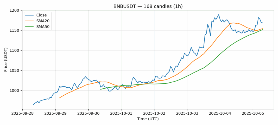 BNB — 1h candles, 7D window (SMA20/SMA50, RSI).