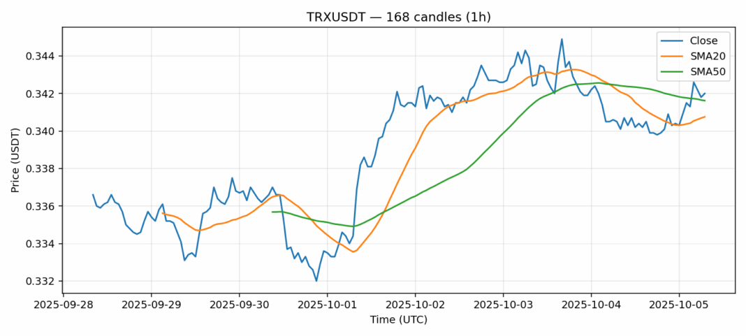 TRX is showing modest momentum with a 0.47% gain over 24 hours, trading at $0.3419 against stablecoin pairing. The RSI reading of 68.4 suggests approaching overbought territory, though not yet at extreme levels. Current price action finds TRX trading between its 20-day SMA ($0.3408) and 50-day SMA ($0.3416), indicating consolidation near key moving averages. The 24-hour volume of $52.3 million demonstrates healthy liquidity, while volatility remains moderate at 0.86%. Traders should watch for a decisive break above the $0.342 resistance level for potential continuation toward $0.345. However, the elevated RSI warrants caution – consider taking partial profits near current levels and setting stop-losses below $0.338. Range-bound trading appears likely unless significant volume enters the market. Monitor Bitcoin’s broader direction for cues, as TRX often correlates with overall crypto market sentiment.