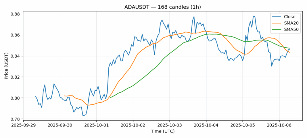 Cardano — 1h candles, 7D window (SMA20/SMA50, RSI).