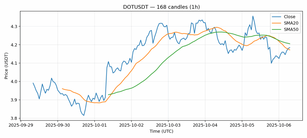 Polkadot — 1h candles, 7D window (SMA20/SMA50, RSI).