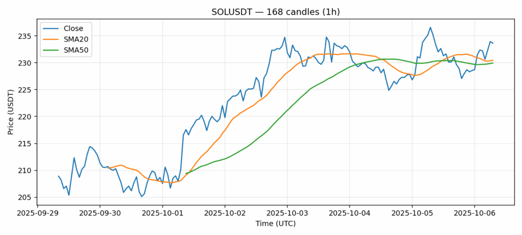 Solana — 1h candles, 7D window (SMA20/SMA50, RSI).