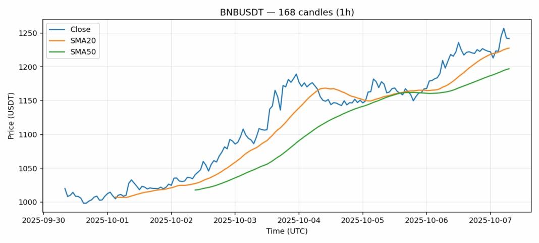 BNB — 1h candles, 7D window (SMA20/SMA50, RSI).