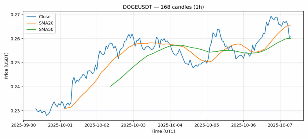 Dogecoin — 1h candles, 7D window (SMA20/SMA50, RSI).