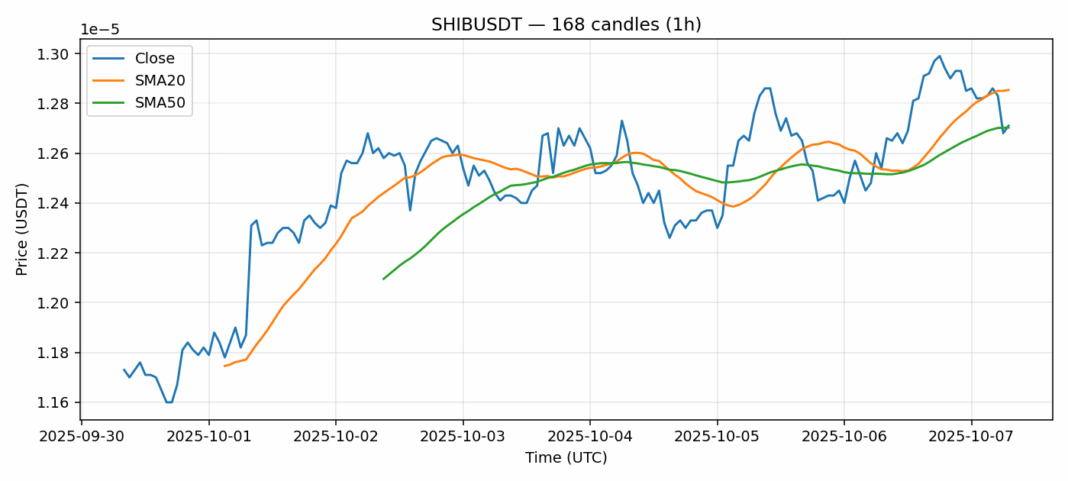Shiba Inu — 1h candles, 7D window (SMA20/SMA50, RSI).