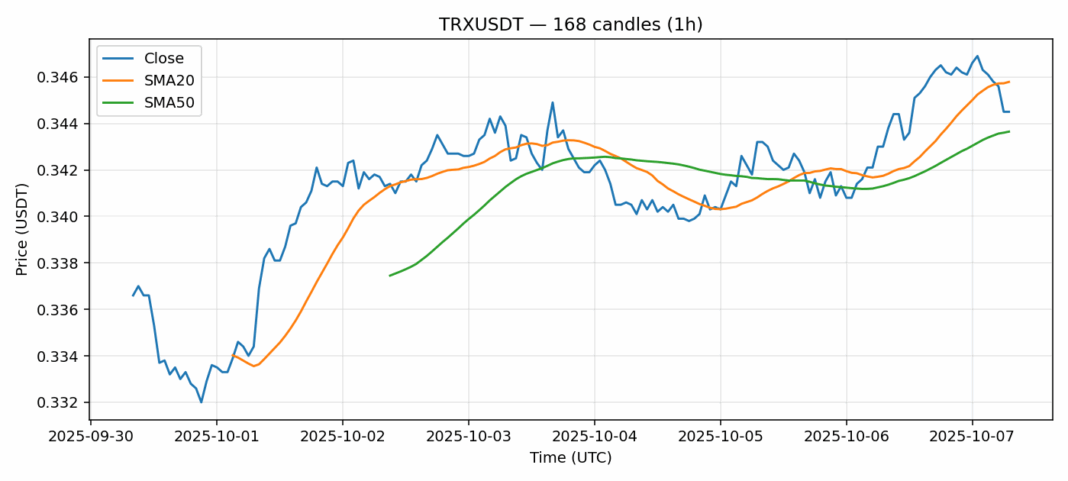 TRON — 1h candles, 7D window (SMA20/SMA50, RSI).