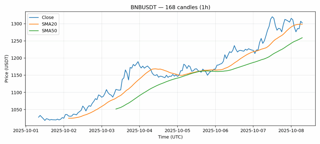 BNB — 1h candles, 7D window (SMA20/SMA50, RSI).