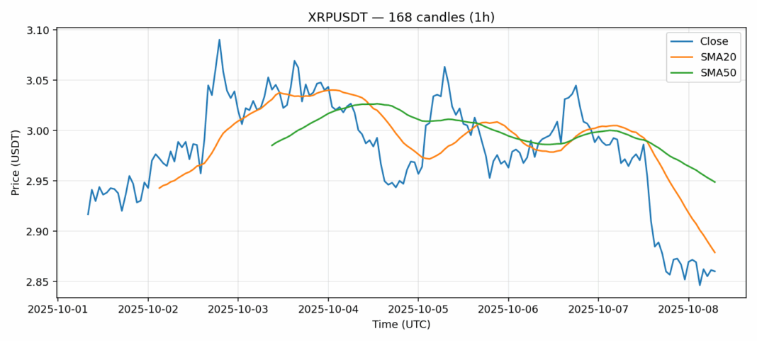 XRP is showing concerning technical signals as it trades at $2.86, down 3.63% over the past 24 hours. The cryptocurrency has slipped below both its 20-day SMA ($2.88) and 50-day SMA ($2.95), indicating weakening momentum. The RSI reading of 43.4 suggests the asset is approaching oversold territory but hasn’t reached extreme levels yet. Trading volume remains substantial at $441 million, showing continued market interest despite the price decline. The current volatility of 2.47% indicates moderate price swings, which could present both risks and opportunities for traders. Given the break below key moving averages, traders should consider waiting for a confirmed reversal pattern before entering long positions. Support appears to be forming around the $2.80 level, while resistance sits near the $2.95 SMA confluence. Risk management remains crucial in this environment, with stop-losses recommended below $2.75 for those holding positions.