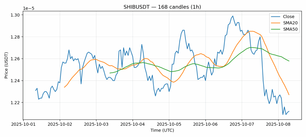 Shiba Inu — 1h candles, 7D window (SMA20/SMA50, RSI).