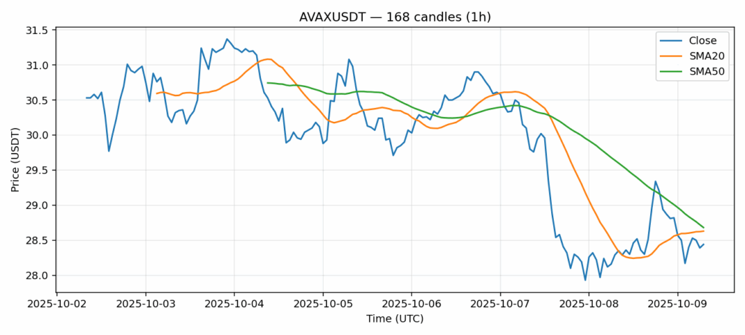 AVAX is showing intriguing technical signals as it trades at $28.44, slightly below both its 20-day ($28.63) and 50-day ($28.68) SMAs, indicating potential consolidation. The RSI reading of 37.7 places AVAX in oversold territory, suggesting limited downside momentum and possible accumulation opportunities. While the 24-hour change of 0.82% shows modest gains, the substantial $67.5 million trading volume indicates healthy market participation. Current volatility at 3.15% reflects typical crypto market conditions. Traders should watch for a decisive break above the $28.65-$28.70 SMA resistance zone, which could trigger momentum toward $30. Support appears firm around $27.50. Given the oversold RSI and proximity to key moving averages, consider scaling into long positions with stops below $27.20. The current setup favors range-bound trading with a slight bullish bias if volume persists.
