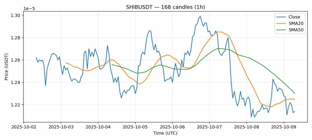 Shiba Inu — 1h candles, 7D window (SMA20/SMA50, RSI).