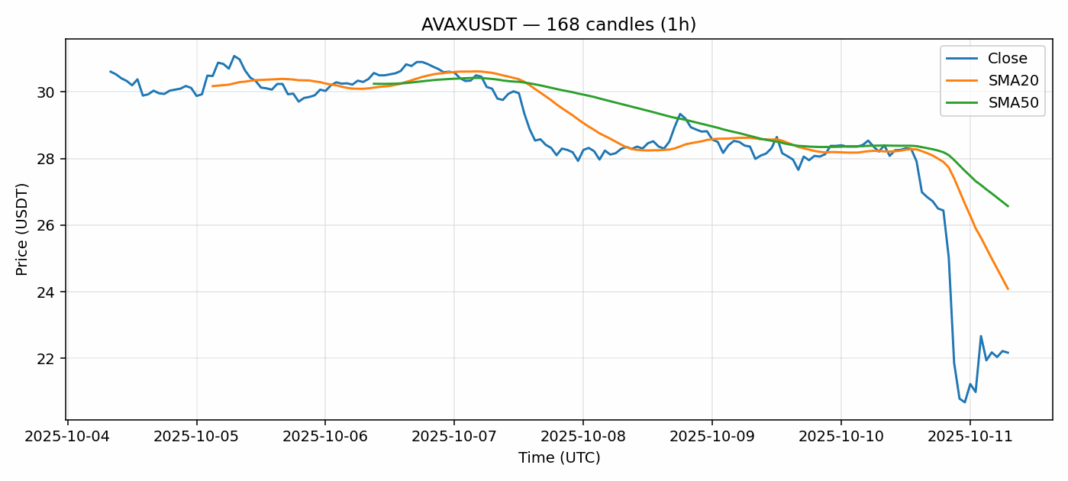 AVAX is showing significant technical distress with a brutal 21.77% decline over the past 24 hours, pushing the price to $22.17 against considerable selling pressure. The RSI reading of 26.9 indicates severely oversold conditions, typically preceding potential relief rallies. However, the price remains below both the 20-day SMA ($24.09) and 50-day SMA ($26.57), confirming the bearish momentum structure. Trading volume exceeding $434 million suggests capitulation-style selling, while elevated volatility at 7.49% warns of continued turbulence. For traders, this presents a high-risk environment – aggressive traders might consider scaling into long positions given extreme oversold readings, but should implement tight stop-losses below recent lows. Conservative traders should wait for confirmation of base formation and RSI recovery above 30 before considering entry. The current levels could attract institutional accumulation, but market structure remains fragile.
