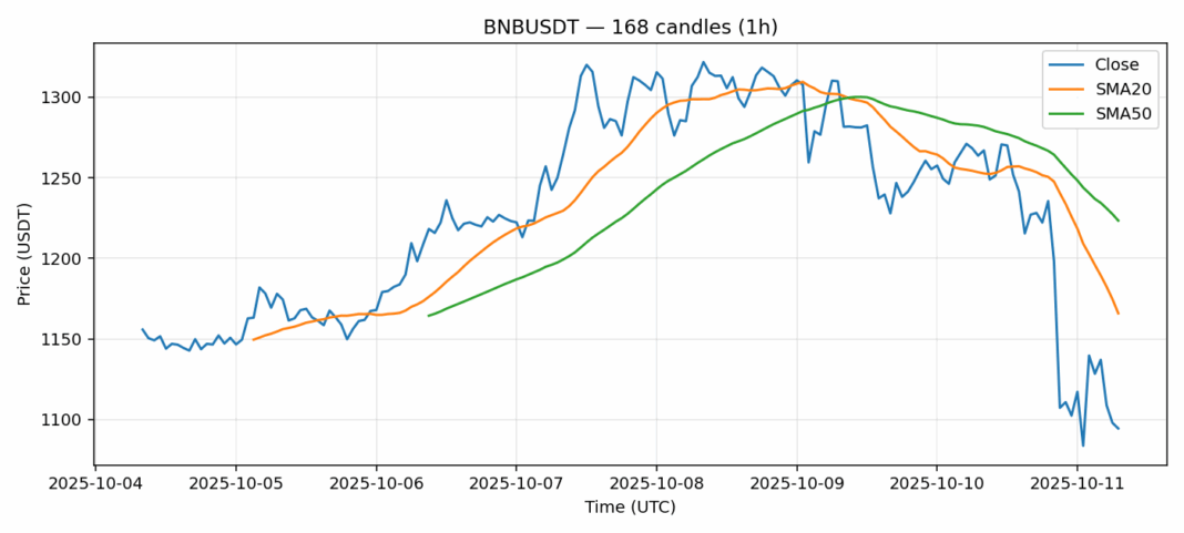 BNB is showing significant technical weakness as it trades at $1,094, down over 13% in 24 hours amid heavy selling pressure. The current price sits well below both the 20-day SMA ($1,166) and 50-day SMA ($1,223), indicating strong bearish momentum. With RSI deeply oversold at 29.5, we’re approaching levels that have historically preceded short-term bounces. However, the high volatility reading of 5.7% suggests continued turbulence. Volume remains elevated at over $2 billion, confirming institutional participation in this move. Traders should watch for potential support around the $1,050-$1,080 zone where previous consolidation occurred. Aggressive traders might consider scaling into long positions with tight stops below $1,040, while conservative investors should wait for RSI recovery above 35 and a break back above the 20-day SMA before entering. The broader market sentiment remains cautious, but oversold conditions could trigger a technical rebound.