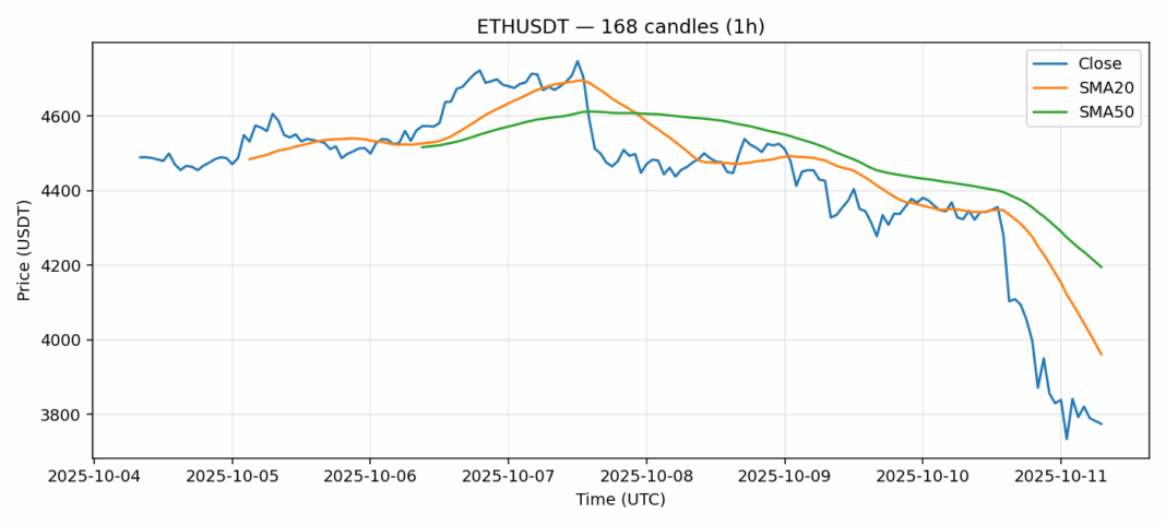 Ethereum is showing significant technical weakness as ETH/USDT trades at $3,775, down 12.77% over the past 24 hours. The current price sits well below both the 20-day SMA ($3,961) and 50-day SMA ($4,195), indicating strong bearish momentum. The RSI reading of 29.15 has entered deeply oversold territory, suggesting potential for a short-term bounce or consolidation. However, with volatility elevated at 4% and substantial selling volume of $6.88 billion, the path of least resistance remains downward. Traders should watch for support around the $3,700 level, which could serve as a critical battleground. Aggressive traders might consider scaling into long positions on further weakness, while conservative investors should wait for confirmation of a bottom formation before entering. Risk management remains paramount given the current market structure.