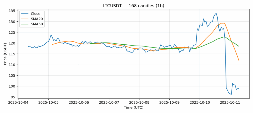 Litecoin — 1h candles, 7D window (SMA20/SMA50, RSI).